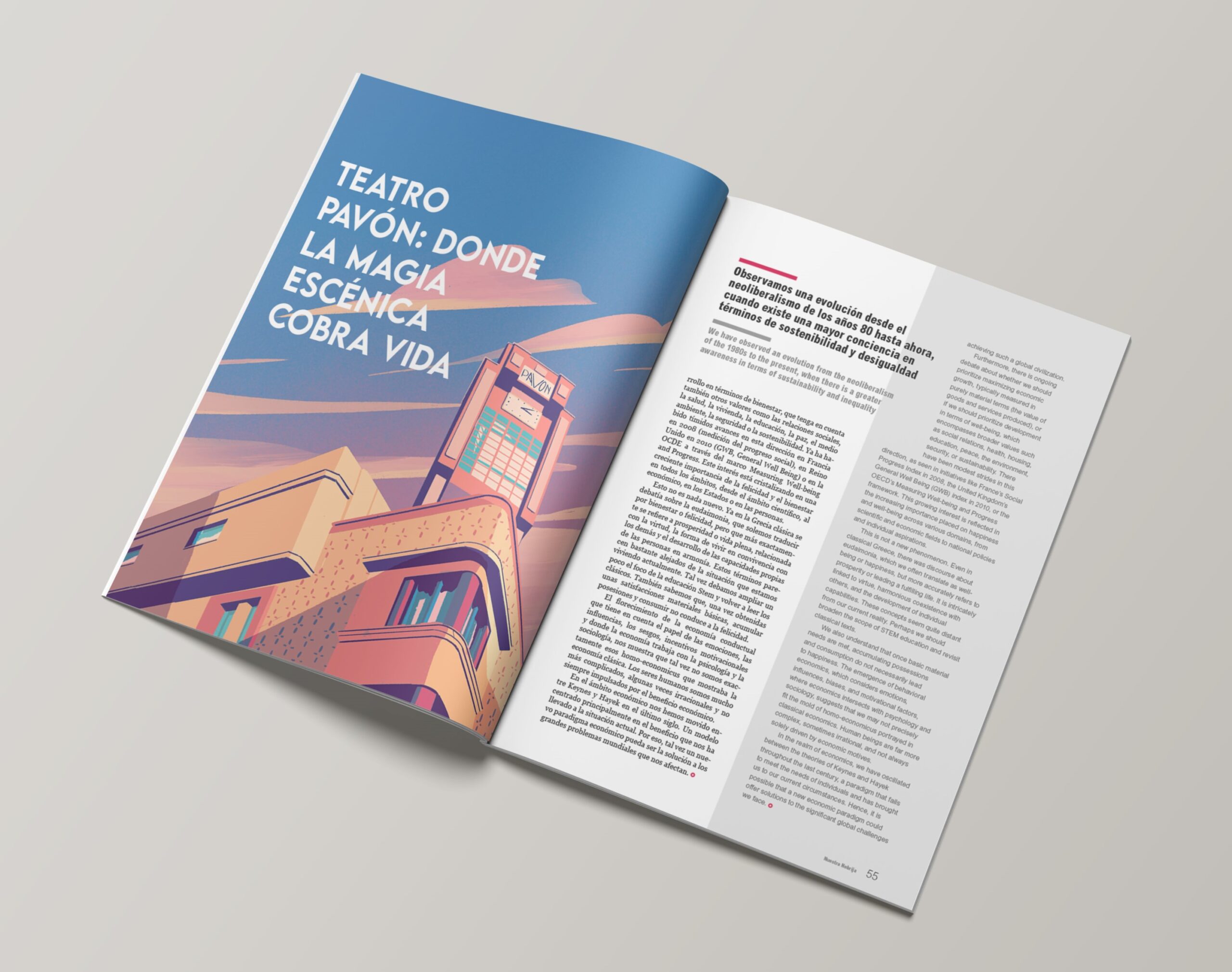 Ilustración del icónico Teatro Pavón de Madrid para la revista Nuestra Nebrija. Capturando la esencia del Art Déco madrileño con una paleta de colores vibrante y líneas elegantes.
